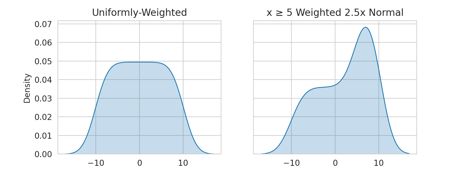 In the above plot, the right side of the second distribution is weighted to be 2.5 times as important as the left side. This is reflected in the density of the distribution.